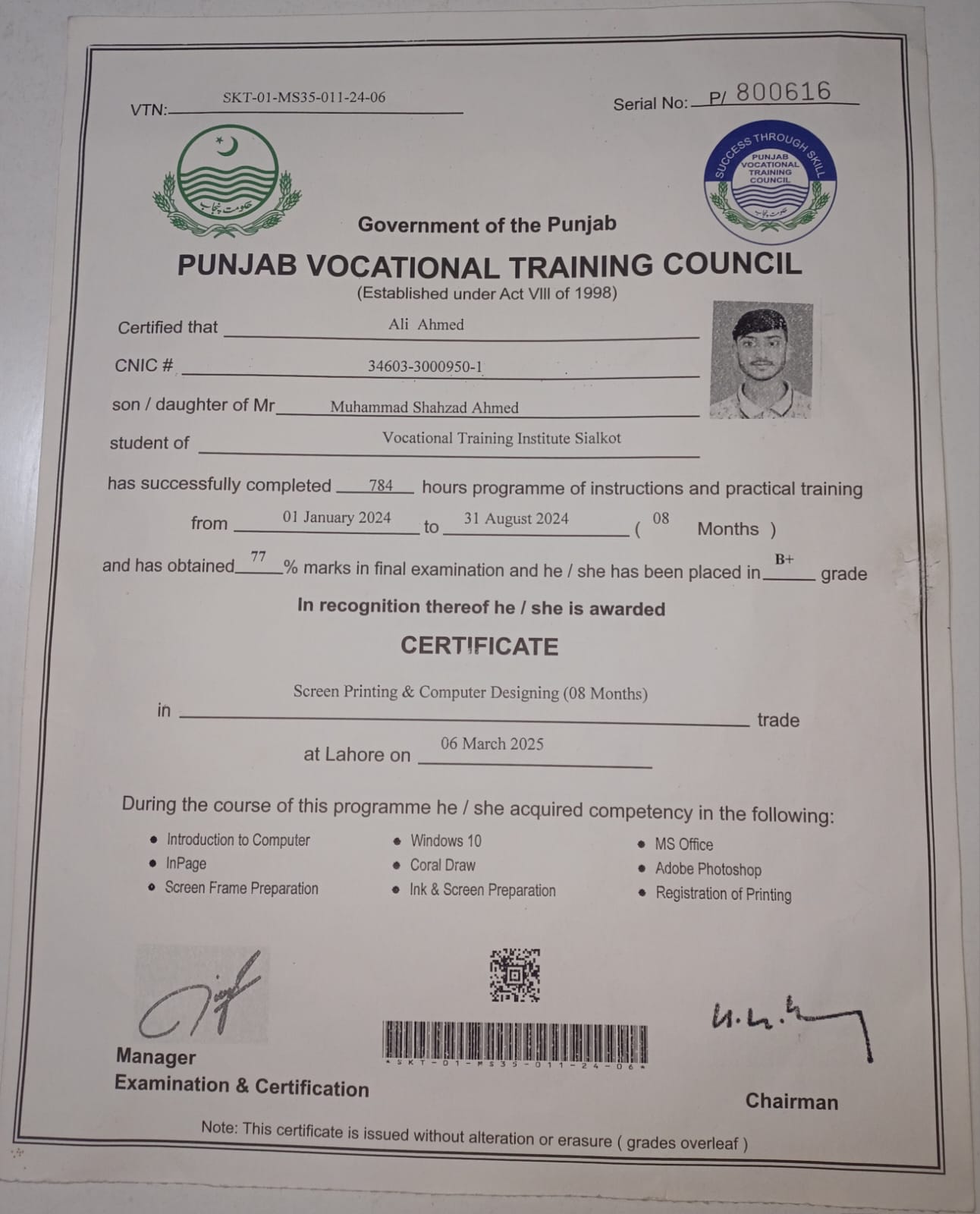 Government certified in Corel DRAW, Screen printing And Web Designing Advanced. Education and Video institute, Sialkot